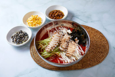 This local specialty of Jeju-do Island is made by slicing well-grown raw conch, mixing it with various vegetables, seasoned in a bowl, and water poured into it. The unique chewy texture of the conch is great, and the gentle seafood flavor that fills your mouth is quite addictive.