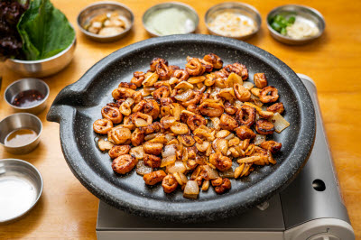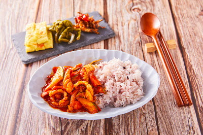 Glass noodles and chopped onions, carrots, and green onions are wrapped in laver and deep-fried. These crispy and savory laver rolls are a popular snack among youths. They commonly enjoy these laver rolls with stir-fried rice – they either dip the rolls in the spicy sauce or mix the rolls with stir-fried rice. You can easily find deep-fried laver roll at street food stalls or snack shops.