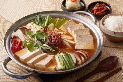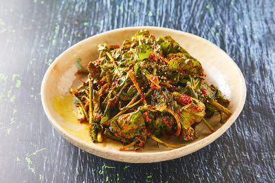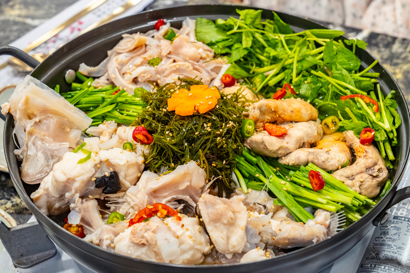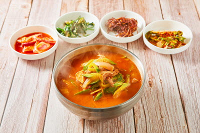 Dried pollack is braised thoroughly and served with bean sprouts and marinade. Sometimes, braised pollack, vegetables, and marinade are boiled together and served. The light flesh of the pollack and the sweet and spicy marinade creates a lovely balance with the crisp vegetables.