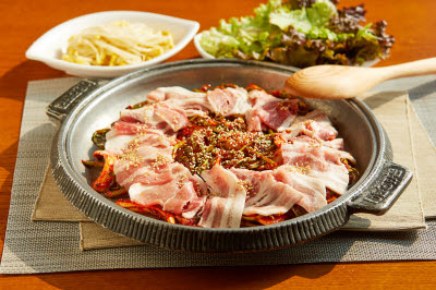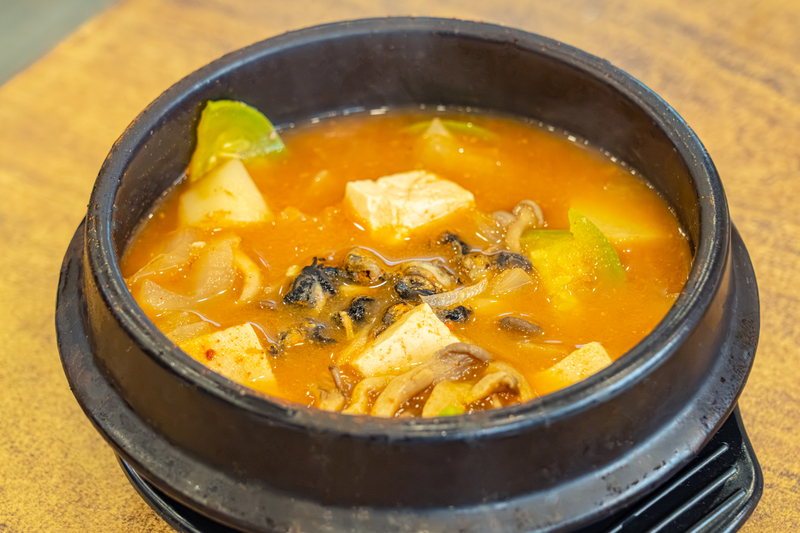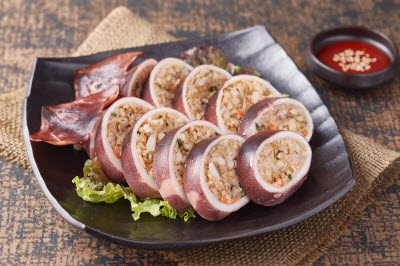 This noodle dish tossed with soy sauce can be enjoyed by everyone, from young children to adults. It is also known as “Guksu Bibim” or “Goldongmyeon.” The word “goldong” refers to the act of mixing. While it can have many different names depending on the ingredient used, Soy sauce noodles can be said to be the basis of all noodle dishes tossed in sauce. The sauce is made by mixing soy sauce with sugar, sesame oil, and ground sesame seed. The noodles are boiled, then rinsed in cold water and drained. One can add spiced beef and mushrooms or egg garnish to enhance the flavor.