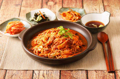 This is kimchi made with chopped cucumber and radish, tossed with chili pepper powder, green onions, garlic, ginger, and salted seafood sauce. It is a kind of diced radish kimchi made in the royal court. Its name comes from the act of chopping used to prepare the cucumbers for this dish. The cucumber is first rubbed with salt, rinsed, then chopped into 3 cm-long pieces. The slices are then salted. Radish is likewise chopped to the same size as that of cucumbers, then salted. The two salted vegetables are then tossed with green onions, garlic, ginger, salted shrimp, and other ingredients before being placed in an earthenware pot.