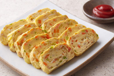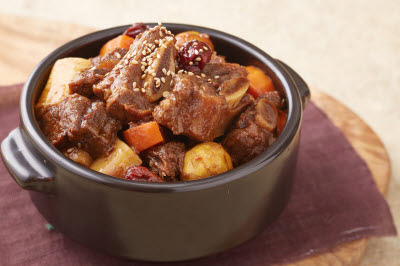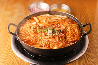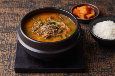 This dish features noodles swimming in a bowl of chilled seaweed soup. It is made by first rehydrating and blanching dried seaweed, tossing the seaweed with vinegar, sugar, garlic, and salted seafood sauce, and adding cucumber and cold broth. Boiled noodles are added to the soup, followed by ice. Blanched shrimp can be added as a garnish. More adventurous souls can add a bit of heat to their bowl, either with extra spicy chili pepper or mustard. Either way, the dish whets one’s appetite with the tender, chewy seaweed and crunchy, refreshing cucumber.