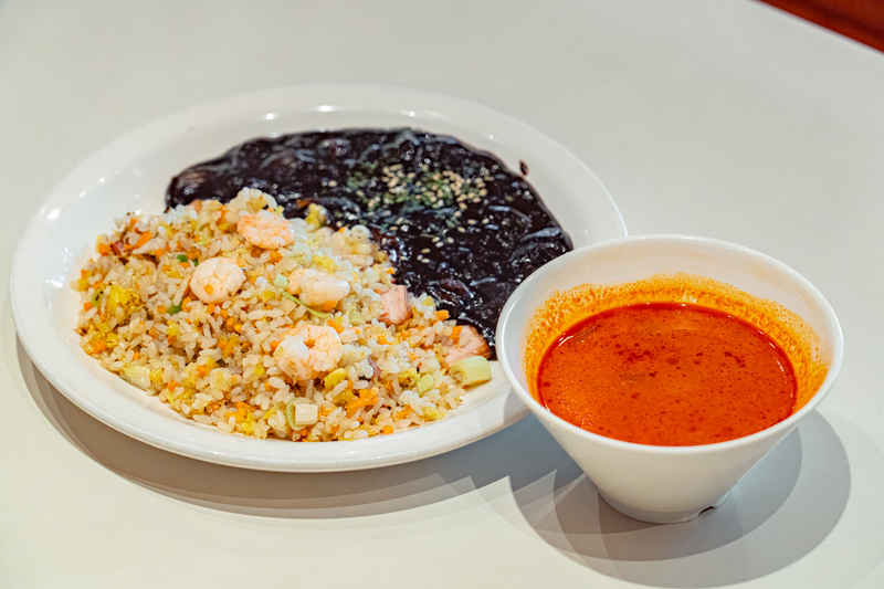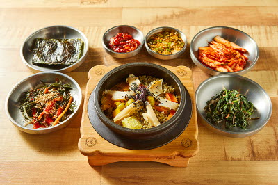 This bowl of noodles features young summer radish kimchi tossed with boiled noodles and sauce. Like its name suggests, young summer radish kimchi is a perfect summer dish, as its crunchy texture and sweet-and-sour tang provide a welcome relief from the heat and loss of appetite. The sauce, made with red chili paste, chili pepper powder, and pear, transitions smoothly from sweetness to heat. The bowl is garnished with a boiled egg, julienned cucumber, and lettuce, which go well with spicy sauce naturally.