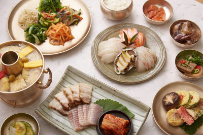 This dish is bibimbap prepared with steamed rice, sliced raw fish, vegetables, and red chili paste with vinegar. Fish featured in this dish include fresh and seasonal fishes like flatfish, salmon, rockfish, and tuna. Other seafood used in the bibimbap include oysters, sea pineapple, squid, and abalone. For vegetables, thinly sliced lettuce, perilla leaves, and cucumber are used. This dish is a great way to enjoy the freshness of sliced raw fish and vegetables, and the sweet-and-sour sauce helps to whet one’s appetite. Steamed rice makes this dish quite filling, making it a perfect meal as well.