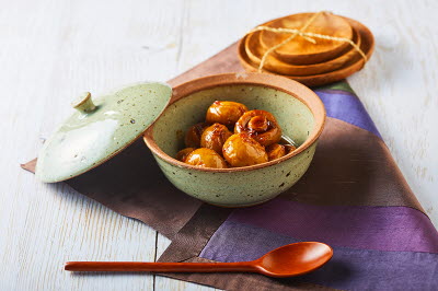 This dish is made by topping pork galbi with kimchi and braising the mixture. Ripe kimchi is an essential part of many Korean favorites such as kimchi jjigae, kimchi pancake, and kimchi fried rice. Braised kimchi and pork galbi are a combination that brings out the best of the two ingredients. Pork galbi is either submerged in water or parboiled to remove blood before being topped with kimchi, followed by addition of rice water and sauce, and then braised until the meat become tender enough to fall off the bones. Wrapping the galbi meat with tender kimchi is the way to enjoy this dish.