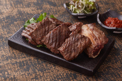 This rice cake is made with sweet rice powder, black soybean braised in sugar, and dried pumpkins. It is traditionally eaten on Jeongwol Daeboreum, the first full moon of the lunar calendar. “Hobak goji,” also called “hobak ogari,” refers to thinly sliced and dried pumpkins. First, sweet rice is soaked overnight and then ground into a fine powder. Second, black soybean is drenched and braised in dark sugar. Third, the dried pumpkin is soaked and mixed with dark sugar. Fourth, hemp cheesecloth is spread over a steamer, and the black soybeans are placed at the bottom. Fifth, the meal is topped with sweet rice powder, chestnut, jujube, and dried pumpkin in layers. Sixth and last, it is steamed, basted with honey, and left to cool and sliced as needed. Dried pumpkin is chewy and sweet, while black soybean offers a rich flavor. Taken together, these rice cakes are a perfect wintertime snack.