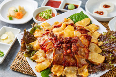 • This hot pot is boiled on the table by piling blue crab, octopus, squid, and other seafood on the pot. Suratang impresses with a refreshing seafood broth that has a cleaner flavor than spicy seafood stew or spicy fish stew. The bean sprouts are laid down on the pot, then squid, shrimp, blue crab, and octopus are piled on the pot to create a mouthwatering visual. Make sure to start with octopus and squid first, as they become tough when cooked for too long. The flavor is an exercise in harmony, from the sweet blue crab meat to the crunchy bean sprouts, fragrant crown daisies, and refreshing soup.